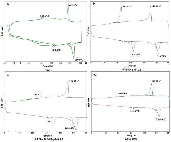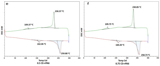 DSC analysis result thermograms of samples (a) rPA6, (b) rPA6 + PP-g-MA 2.5, (c) 0.2CE+rPA6 +PP-g-MA 2.5, (d) 0.2CE+rPA6, (e) 0.5CE+rPA, and (f) 0.75CE+rPA6.