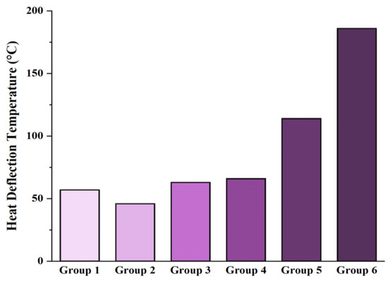 The HDT test results for rPA6/rPP blend-based composites are shown in Figure 6. The measured HDT values were 57 °C for Group 1, 46 °C for Group 2, 63 °C for Group 3, 66 °C for Group 4, 114 °C for Group 5, and 186 °C for Group 6, indicating significant variations in the thermal stability of the composites. A 30% increase in HDT values was observed with the addition of PP-g-MA. A 5% increase in HDT values was achieved with the addition of CE. When 10% CF was added to the CE-based blend, a 42% increase in HDT was achieved. Furthermore, the addition of 20% CF resulted in a 65% increase in HDT. These results demonstrate that the incorporation of carbon fibers and chain extenders significantly enhances the thermal stability of the composites, with a notable improvement in HDT values observed with a higher carbon fiber content. The thermodynamic incompatibility between rPA6 and rPP can negatively affect their thermal properties. Therefore, the incorporation of rPP into rPA6 may weaken the thermal stability and result in a decrease in the HDT value. The literature frequently highlights the beneficial effects of additives, particularly coupling agents and chain extenders, on the thermal properties of polymer blends. These additives can enhance thermal stability by creating stronger bonds between polymer matrices, which can lead to improvements in the HDT values [15,17,68,69,70,71]. The addition of PP-g-MA and CEs has improved the compatibility between the polymers, leading to an increase in the HDT value. This observation is consistent with the findings reported in the literature. CNTs, graphene, fullerenes, and CFs are significant materials that enhance the thermal properties of polymer matrices. The optimal loading of carbon nanofillers can improve the interactions between the polymer matrix and the filler, leading to an increase in thermal degradation temperatures. These interactions reinforce the molecular structure of the polymer, thereby enabling the composite materials to withstand higher temperatures. The incorporation of carbon fibers results in improvements that help maintain the stability of the polymer matrix at elevated temperatures, significantly enhancing the HDT values [72].