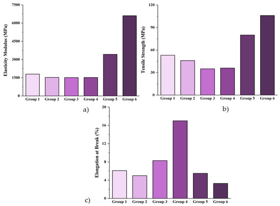 Tensile properties of rPA6/rPP blend based composites; (a) Elasticity Modulus (MPa), (b) Tensile Strength (MPa), (c) Elongation at Break (%) are shown in Figure 7. The elastic modulus is considered a measure of a material’s rigidity, as it relates to the material’s resistance to deformation [78]. The analysis of the elastic modulus values revealed the following results: 1796 MPa for Group 1, 1530 MPa for Group 2, 1510 MPa for Group 3, 1520 MPa for Group 4, 3425 MPa for Group 5, and 6606 MPa for Group 6. The addition of rPP into rPA6 resulted in a 14.8% reduction in the elastic modulus. This reduction is attributed to the softer phase introduced by rPP in the rPA6 matrix. The addition of a chain extender increased the elastic modulus. In his study, Tuna [79] related the observed increase in modulus to the concentration of the chain extender. The enhancement was attributed to the increased number of polymer chains being cross-linked, which subsequently raised the viscosity. This effect is linked to a higher molecular weight and chain branching, both of which contribute to improved mechanical properties, including the elastic modulus. With the addition of 10% CF to the polymer matrix, the elastic modulus increased by 125.33%, and with the addition of 20% CF, it further increased by 92.88%. The improvement in hardness with the inclusion of the filler can be explained as follows: Under the influence of a compressive force, the thermoplastic matrix phase and the solid filler phase will press against each other, coming into contact and resisting. This interaction allows for more effective load transfer, even if the interfacial bond is weak. Consequently, the hardness of the filled composites increases [80]. In their study, Hiremath et al. [81] investigated the properties of PAN polymer composites, where they applied a surface treatment to the CF to enhance compatibility with the matrix. The results showed an increase in the elastic modulus with the addition of carbon fibers, attributing this enhancement to the high strength and elastic modulus of the CF. The addition of CF to rPA/rPP polymer composites has enhanced molecular interactions, thereby improving the load transfer efficiency.