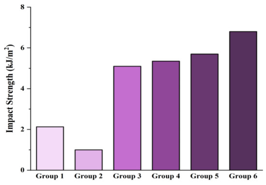The impact strength results of rPA6/rPP blend-based composites are presented in Figure 8. The measured impact strength values for the six groups are as follows: Group 1, 2.13 kJ/m2; Group 2, 1 kJ/m2; Group 3, 5.1 kJ/m2; Group 4, 5.35 kJ/m2; Group 5, 5.7 kJ/m2; and Group 6, 6.8 kJ/m2. The rPA6/rPP blends exhibit lower impact strengths compared to the neat rPA6 matrix. This reduction can be attributed to the thermodynamic incompatibility between rPA6 and rPP polymers. The literature indicates that such incompatibility in polymer blends leads to phase separation within the material, thereby adversely affecting mechanical performance. Consequently, the rPP phase is unable to effectively absorb fracture energy, resulting in a significant decline in impact strength [92]. However, the addition of a compatibilizer such as PP-g-MA to the rPA6/rPP blends has resulted in a significant improvement in impact strength. PP-g-MA enhances interfacial adhesion between rPA6 and rPP, thereby improving interphase compatibility and subsequently increasing the mechanical performance of the blend. This observation is consistent with findings in the literature, where the incorporation of compatibilizers has been frequently reported to strengthen interfacial interactions in polymer blends, leading to enhanced impact strength [93,94]. The addition of a CE and CF to PA6 has significantly improved its impact strength. Chain extenders increase the molecular weight of the polymer matrix, which not only enhances its energy absorption capacity but also contributes to reducing crack formation by improving the overall structural integrity of the material [95]. Carbon fibers facilitate effective load transfer during impact, distribute stress, and delay crack propagation. Wang et al. [96], in their study investigating the effects of CF on PP, suggest that there is a strong interfacial bond between the matrix and fibers, which increases the impact toughness.
