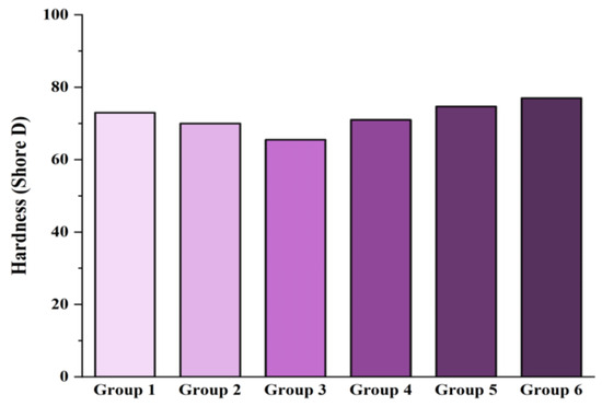 The hardness values of the rPA6/rPP blend-based composites are presented in Figure 9. The experimental results for Groups 1 through 6 are as follows: 73, 70, 65.5, 71, 74.7, and 77 Shore D. These results indicate a decrease of approximately 4% in hardness with the addition of rPP into rPA. Savas et al. [101], in their studies investigating the effect of bone ash on PA6/PP blends, reported that increasing the PP content led to a decrease in hardness. Although PA6 is a high strength polymer, its ductility is relatively lower compared to PP. Moreover, the addition of PP-g-MA resulted in a decrease in hardness by approximately 6%. In contrast, composites reinforced with chain extenders showed an increase in hardness. This suggests that the CEs enhance the polymer’s structure, leading to higher hardness values. Furthermore, incorporating CF into the polymer composites resulted in continued hardness improvement. CF, known for its high strength and rigidity, positively influences the mechanical properties of the blend. In the literature, previous studies generally report an increase in hardness values due to the high surface area and hardness characteristics inherent to carbon-based nanomaterials. Additionally, the use of coupling agents is believed to enhance the chemical compatibility between the NH groups in the nylon structure and the CFs, promoting covalent and hydrogen bonding interactions [102,103]. These interactions contribute to the improvement of the mechanical properties of the composite materials, further supporting the observed increase in hardness. Furthermore, the relationship between the elastic modulus and hardness has been widely acknowledged in the literature, and the results of the elastic modulus and hardness obtained in this study show consistent and parallel trends, further validating the findings [104].