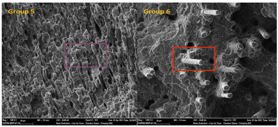 SEM images of Group 1, Group 2, Group 3, Group 4, Group 5, and Group 6 samples (10 kV voltage rate, ×1.00 kx magnification ratio, SE (Secondary Electron) detector, 10 mm working distance). There are differences in material morphology with different color squares.