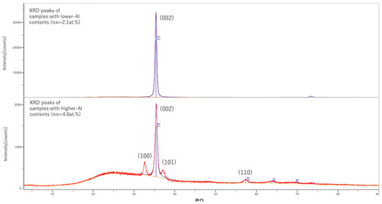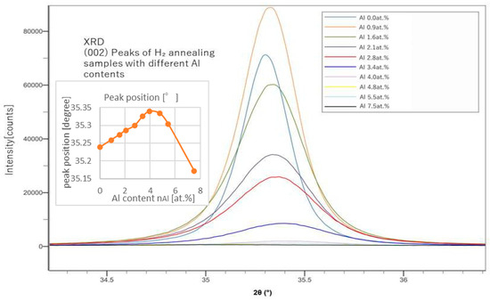 XRD (002) peaks of samples with different Al contents (after H2 annealing).
