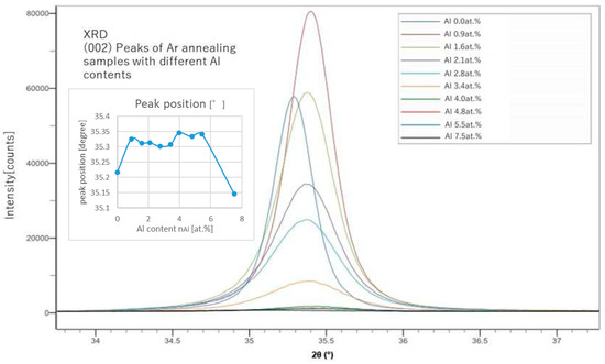 XRD (002) peaks of samples with different Al contents (after Ar annealing).