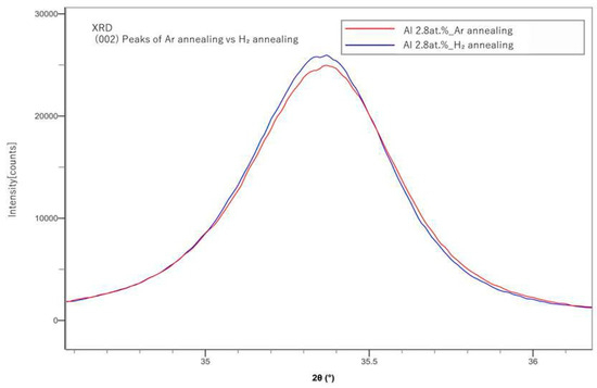 In Figure 4, (002) peaks of the Ar-annealed samples and the H2-annealed samples were compared. H2 annealing showed slightly sharper peaks than those of the Ar-annealed samples. In Figure 1, Figure 2, Figure 3 and Figure 4, instrumental broadening was corrected with the crystalline material of LaB6, which is an established standard in XRD measurements. The peaks for all cases mostly appeared between 35 and 35.5 degrees, which is in line with the results presented by a previous study [20].