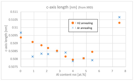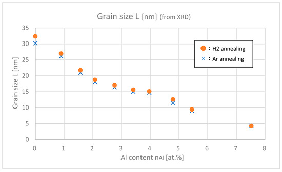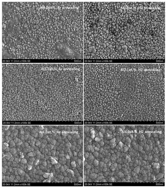 Figure 8 shows the estimated grain sizes of samples with differing Al contents. As for both argon and hydrogen annealing, the grain size decreases as Al content increases. The decrease in film thickness shown in Figure 7 is consistent with this decrease in grain size. Furthermore, if we focus on details, the samples with H2 annealing have slightly (about 8 Å) larger grain sizes than the samples with Ar annealing. This implies that H2 annealing can support the growth of grains much more efficiently.