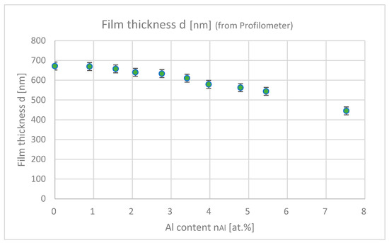 Figure 7 shows the film thicknesses of samples with differing Al contents. As the Al content increases, the film thickness decreases because of Al-induced impurities, which inhibits the film growth.