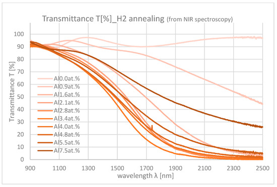 Transmittances of the samples with differing Al contents in NIR range (H2 annealing).