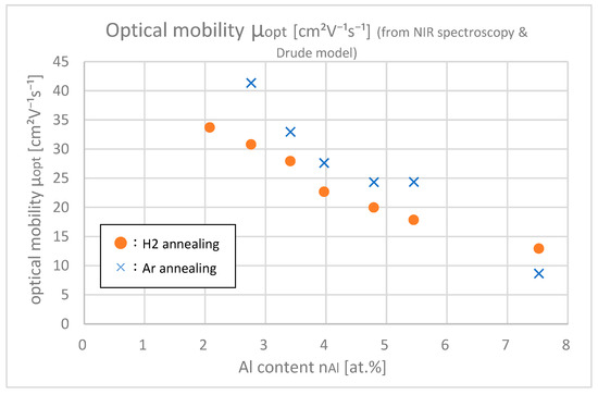 Figure 12 shows the optical mobilities of samples with different Al contents obtained from optical fitting. Only in the range that the absorption was clearly found ( > 2.5 at.%) was optical fitting possible. This proves that samples with Ar annealing have larger optical mobilities than samples with H2 annealing. Comparison of Ar annealing with H2 annealing shows that the ion impurity scattering in the intragrain region increased after H2 annealing compared to Ar annealing. This can be explained by the process where hydrogen gets introduced in the bulk via H2 annealing, which essentially works as a dopant, and H+ increased the ion impurity scattering.