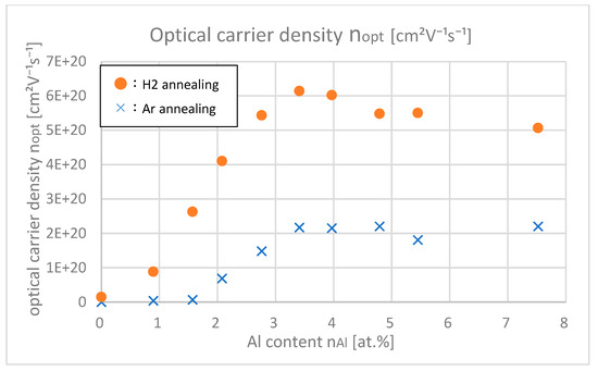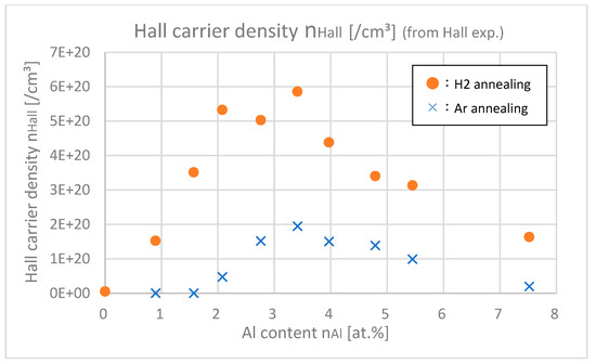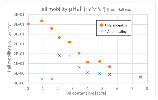 Figure 15 shows the Hall mobilities of samples with different Al contents. At any Al content, especially in low-doped samples, Hall mobilities of H2-annealing samples are larger than those of Ar-annealing samples. As the Al content increases, this difference decreases. This result means that the Al–H interaction negatively affects the improvement of μHall.