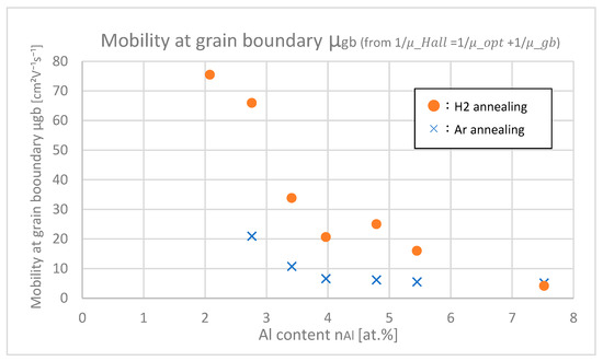 From Figure 12 and Figure 15 and Equation (4), the mobilities at grain boundaries μgb were calculated, which is shown in Figure 16. At any Al contents, μgb of H2-annealed samples are larger than those of Ar-annealed samples. This shows that H2 annealing improves mobility at the grain boundaries.
