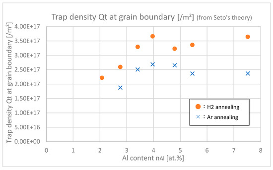 In Figure 17, the trap densities Qt at grain boundaries of samples with differing Al contents are shown. Trap densities of H2-annealed samples at any Al contents were larger than those of Ar-annealed samples, which indicates that H2 annealing increases the trap densities. This is due to the fact that hydrogen itself or its complex works as a trap at grain boundaries. The increase in trap density negatively affects μgb; nevertheless, H 2 annealing finally increased μgb as shown in Figure 16. This is probably because carrier density n increased after H2 annealing as shown in Figure 13 and Figure 14, and then subsequently the potential barriers at grain boundaries decreased, which was relatively dominant that the μgb was eventually increased by H2 annealing.