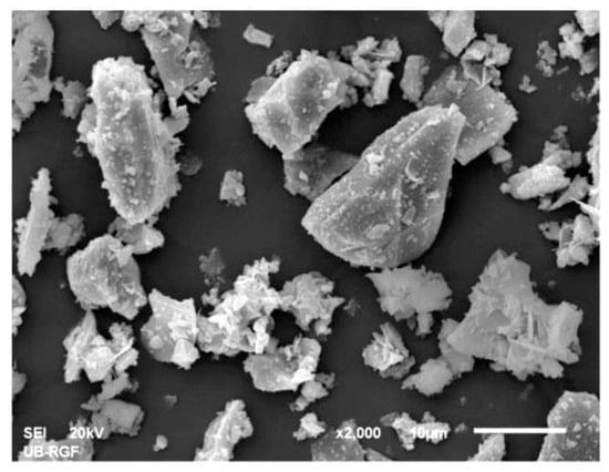 The SEM microphotograph of the synthetized filler is given in Figure 2. From the microphotograph, it can be seen that big hexagonal angular grains are present in the observed grain mixture. These particles might correspond to the cordierite mineral phase, since cordierite is characterized by an orthorhombic pseudohexagonal symmetry, which gives way to a hexagonal symmetry at temperatures near the melting point [40]. Also, the cordierite particles are predominantly from 10 µm to 20 µm in size, which is in the same dimensional range as the biggest particles in the observed mixture. Quartz grains are usually classified as very angular [35]. Their diameter is usually around 15 µm [41]. Extremely angular particles of the previously stated average diameter are visible in the observed grain mixture. Corundum has a cubic crystal morphology [42]. The size of corundum particles is below 10 µm. The small cubically shaped grains are present in the filler mixture. The spinel mineral is characterized by sharp octahedral crystals [43]. The small needle-like or sharp octahedral particles are present in the observed grain mixture (periclase).