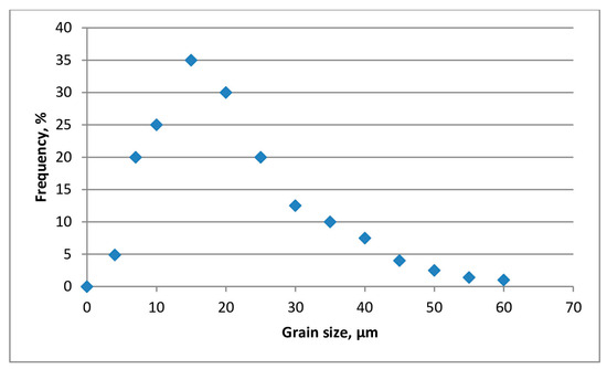 The measurement of the grain size and shape factor was performed on 3610 grains. The average grain size is 17.16 µm. The smallest and largest measured grain sizes are 1.04 and 57.16 µm, respectively. The standard deviation is σ = 10.46 µm. The average grain shape factor is 0.67. Based on the given data, the grains of this sample belong to the category of rounded grains. The maximum grain shape factor is 0.81 and the minimum grain shape factor is 0.15. The standard deviation is σ = 0.09. Figure 3 and Figure 4 show the histograms of the grain size and shape factor of the cordierite samples.