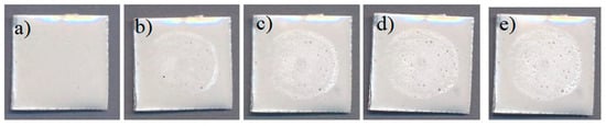 Photographs of the coated surface after cavitation erosion for the following durations: (a) 0; (b) 15; (c) 30; (d) 45; and (e) 60 min.