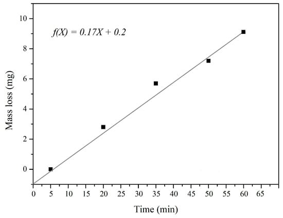 The formation of superficial pits, i.e., damage that occurs to the surface of the coating, is a result of the slow loss of mass from the coating’s surface. The mass loss depicts the damage outcomes after each cavitation sequence (i.e., 0, 15, 30, 45, and 60 min). After 15 min of erosion, the sample lost 3 mg, which is approximately 0.9% of the total sample weight. A total of 30 and 45 min of erosion caused 1.4% and 2.3% of mass loss, respectively. The highest mass loss (3.6%) was registered after 60 min of cavitation erosion. The rate of cavitation is calculated from the measured mass loss for every testing period. The points of the diagram are approximated by a straight line using the least squares method. The tangent of the slope depicts the loss of mass during the period of cavitation activity and represents the rate of cavitation erosion. For each set of the tested samples, three samples were used, and the findings represent the mean value of these measurements for each test interval. The cavitation rate given in Figure 6 is a quantifiable measurement of the intensity of material degradation caused by cavitation.
