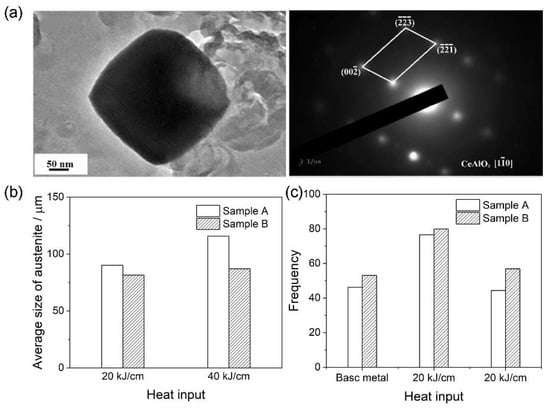 (a) Nano-sized Ce-containing inclusions in the CGHAZ. (b) Average sizes of the austenite grains in the CGHAZ at different heat inputs. (c) Frequency of high-angle grain boundaries with misorientation angles larger than 45° in samples A and B at different heat inputs [37].