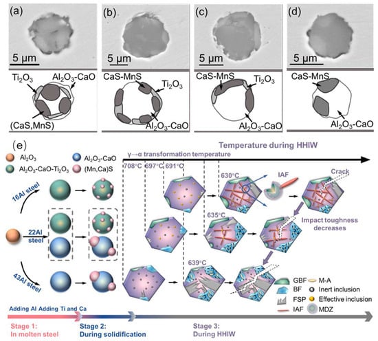 (a–d) Morphologies of the typical inclusions in the CGHAZs of (a,b) 16Al steel, (c) 22Al steel, and (d) 43Al steel. (e) Schematic illustrations of inclusion characteristics and ferrite transformation in CGHAZ after HHIW with 400 kJ/cm for the 16Al, 22Al, and 43Al steels [48].