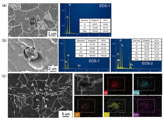 The relationship between inclusions and ferrite in the HAZ of No. 1 steel: (a) Al2O3; (b) Al2O3 + MnS; (c) mapping scanning results and the relationship between the Al–Mg–O + MnS and ferrite in the HAZ of Mg-treated steel at W2 heat input [19].