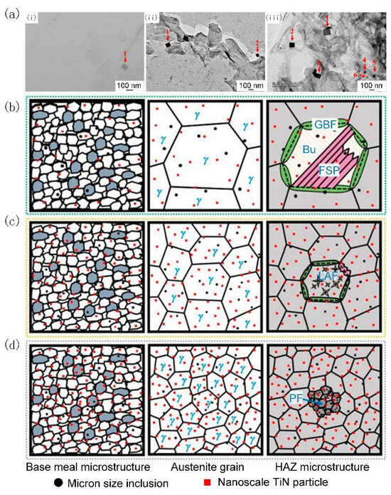 (a) Distribution of the nanoscale titanium nitride (TiN) particles in HAZs of (i) A, (ii) LM, and (iii) HM. (b–d) Schematic diagram of the mechanism for improving the HAZ toughness by inclusion control with Mg deoxidation: (b) A, (c) LM, and (d) HM. The black dots and the red square in the schematic diagram are micron-sized inclusions and nanoscale TiN particles [54].
