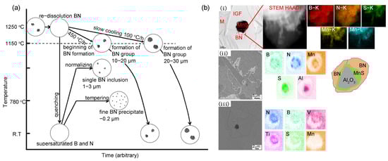 (a) Schematic diagram of BN formation behaviors in P122 steel under various heat treatments [69]. (b) The SEM and HADDF image of IGF at a 700 °C (i) and CGHAZ (ii,iii) [70].