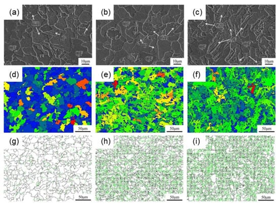 (a–c) SEM of HAZ after performing the welding process on the specimens: (a) EH36 steel, (b) EH36 steel with Mg treatment and (c) EH36 steel with Mg treatment; (d–f) Effective grain size of HAZ after performing the welding process on the specimens: (d) EH36 steel, (e) EH36 steel with Mg treatment, and (f) EH36 steel with Mg treatment. (g–i) The distribution of grain boundary orientation of HAZ after performing the welding process on the specimens: (g) EH36 steel, (h) EH36 steel with Mg treatment. and (i) EH36 steel with Mg treatment. In figures (g,h), the black line represents the small-angle grain boundary, which ranges from 2° to 15°, while the green line signifies the large-angle grain boundary, exceeding 15° [75].