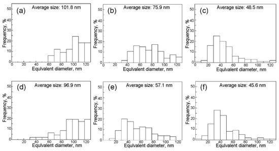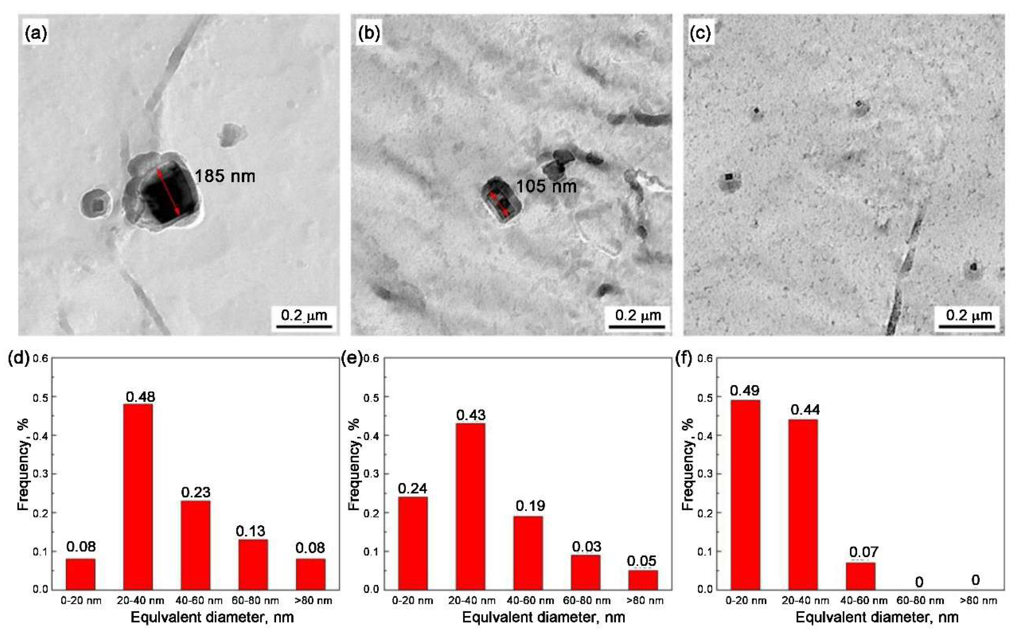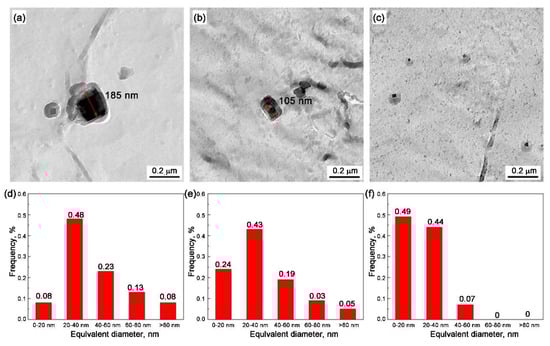 Size distributions of precipitates in high–heat–input welding steels with different Ti/N ratios: (a,d) Ti/N = 5.85; (b,e) Ti/N = 4.22; and (c,f) Ti/N = 2.82 [15].