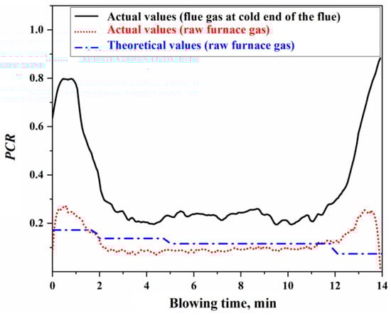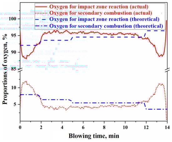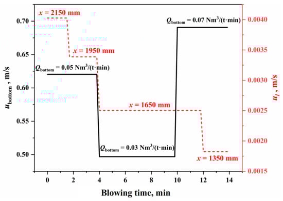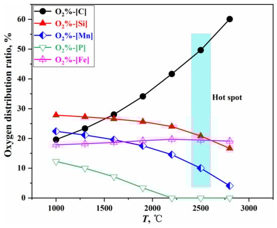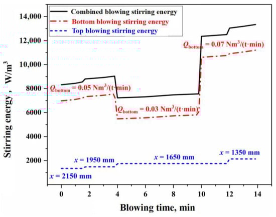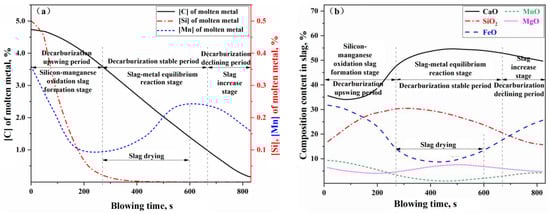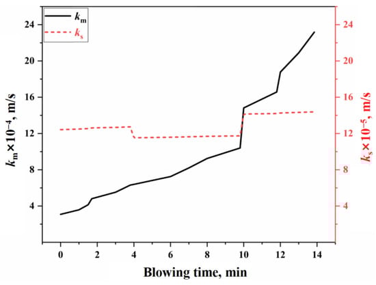 - The oxygen distribution ratio among the elements in the gas–liquid reactions of the jet impact zone is determined by the Gibbs free energy contributions of each reaction. The kinetic conditions for the slag–metal reactions in the molten bath surface zone are primarily controlled by bottom blowing, which contributes approximately 80% to the overall stirring energy. Under typical operating conditions, the effective mass transfer coefficient on the molten metal side is (3.08–23.18) × 10−4 m/s, while, on the slag side, it is (12.42–14.38) × 10−5 m/s. Additionally, the overall effective decarburization rate of the droplets ranges from 0.47 to 0.87.