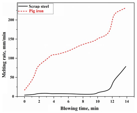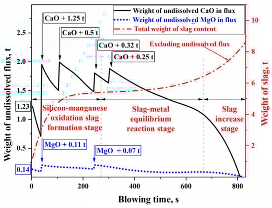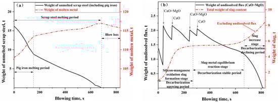 - In the three auxiliary reaction zones, approximately 6% of the top-blown oxygen is utilized for the secondary combustion of the furnace gas in the gas phase homogenization zone. The melting of scrap steel is influenced by both the carbon concentration and thermal drives, while the melting of pig iron is primarily controlled by thermal mechanisms. The dissolution rate of CaO and MgO fluxes in the slag homogenization zone is determined by the concentration gradient and the stirring intensity of the BOF. The dissolution rates of the fluxes are relatively fast in the early and late stages of the blowing process, while they are slower during the mid-process.