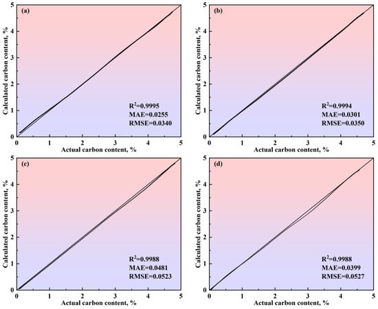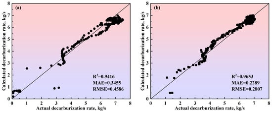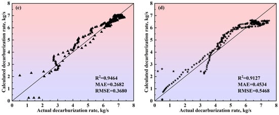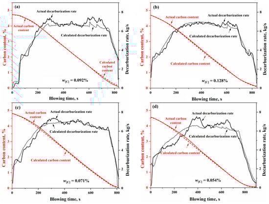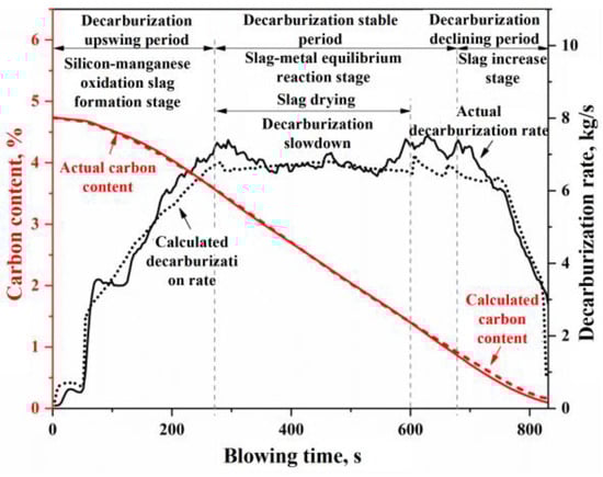 - The multiphase reaction zone was divided into three main reaction zones and three auxiliary reaction zones in the converter, and the reaction mechanisms of the six zones were analyzed from both thermodynamic and kinetic perspectives. Based on this, a multi-zone reaction mechanism model was established, and the accuracy of the model was verified according to actual production data. The results show that the calculated decarburization rate curves and carbon content curves derived from this comprehensive model closely match both the overall profiles and local morphological features of the actual curves from the furnace operation. The relative deviation of the cumulative decarburization rate (i.e., total decarburization amount) ranges from −0.66% to 1.68%, while the absolute deviation of the calculated carbon content curve compared to the actual curve is less than 0.12%. The prediction error for the final carbon content is −0.028–0.073%.
