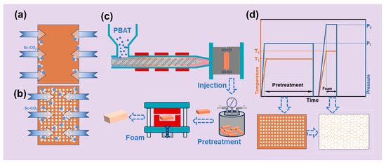 Schematic of PBAT foam preparation. (a) One-step foaming of PBAT sheets; (b) foaming of PBAT pretreated sheets; (c) schematic diagram of the PBAT sheet pretreatment–short-duration foaming process; (d) parameter distributions during pretreatment–short-duration saturated foaming process.