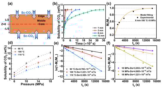 CO2 sorption and diffusion in untreated PBAT sheets. (a) Schematic diagram of CO2 diffusion in PBAT matrix; (b) CO2 sorption in PBAT sheets of different thicknesses at 100 °C—18 MPa; (c) fitting of Fick’s diffusion model; (d) isothermal sorption of CO2 in PBAT; (e) kinetic linear fitting of diffusion coefficients at different temperatures; and (f) kinetic linear fitting of diffusion coefficients at different pressures.