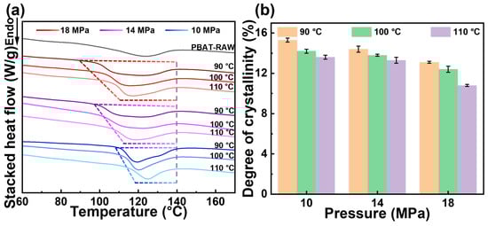 PBAT foam thermal behavior. (a) DSC curves of the PBAT samples treated under various pressures and temperatures; (b) degree of crystallinity based on DSC pattern.
