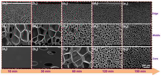 SEM image of the evolution of the cell structure of untreated PBAT sheet (6 mm thickness) with saturation time at 100 °C—18 MPa. (a1–e1) evolution of the cell structure in the edge region with saturation time (10–150 min); (a2–e2) evolution of the cell structure in the middle region with saturation time (10–150 min); and (a3–e3) evolution of the cell structure in the core region with saturation time (10–150 min).