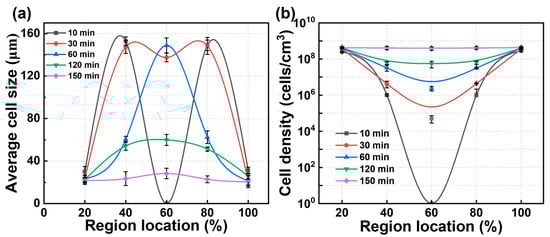 Dynamic information on the cell structure of PBAT foams obtained at 100 °C—18 MPa. (a) Cell size across different positions at different times; (b) cell density across different positions at different times.