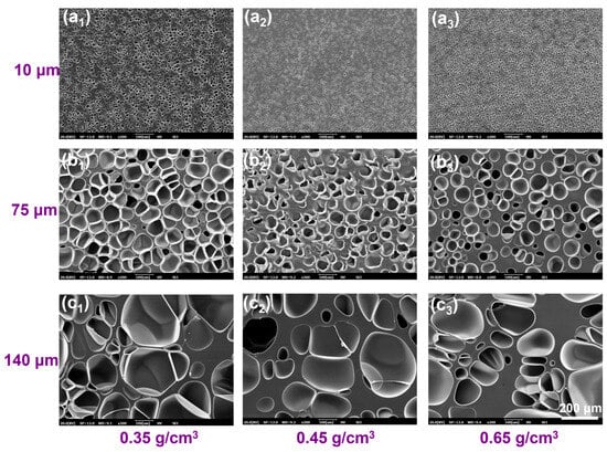 SEM image of microporous structures of typical PBAT pretreated sheets. (a1–c1) samples with different microporous sizes at a density of 0.35 g/cm3; (a2–c2) samples with different microporous sizes at a density of 0.45 g/cm3; (a3–c3) samples with different microporous sizes at a density of 0.65 g/cm3.