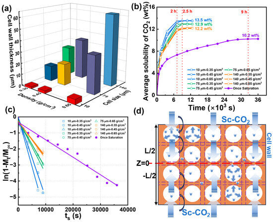 The diffusion coefficients of CO2 in different pretreated sheets are shown in Figure 7c by linear fitting. Compared to the once-saturated foaming process of untreated PBAT sheets, the diffusion fitting curves of the pretreated sheets shift downward, indicating that the introduction of microcellular structures in the PBAT matrix enhances the diffusion coefficient. As shown in Table 3, the diffusion coefficient is highest when the microporous wall is thinnest, at 2.01 × 10−8 m2/s, and lowest when the microporous wall is thickest, at 7.16 × 10−9 m2/s. After pretreatment, the diffusion coefficient increases by a factor of 6 to 16 compared to the single foaming process. A potential explanation for the rapid diffusion process is provided in Figure 7d, where the introduction of microporous structures into the PBAT matrix via pretreatment results in the formation of numerous hollow regions. During diffusion, CO2 is first sorbed into the micropore walls, then rapidly fills and saturates the microporous regions. In contrast, untreated PBAT sheets require CO2 to diffuse through the entire matrix during saturation, whereas the microporous walls provide a weaker diffusion barrier. Overall, CO2 diffuses more rapidly in pretreated sheets with thinner microporous walls, while higher micropore densities provide more space for gas storage, resulting in higher solubility.