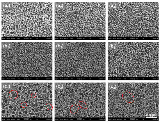 SEM images of foamed PBAT sheets with different microporous structures (red circles show graded cell structures). (a1–c1) samples with different micropore sizes of 10 μm, 75 μm and 140 μm at a density of 0.35 g/cm3; (a2–c2) samples with different micropore sizes of 10 μm, 75 μm and 140 μm at a density of 0.35 g/cm3; (a3–c3) samples with different micropore sizes of 10 μm, 75 μm and 140 μm at a density of 0.35 g/cm3.