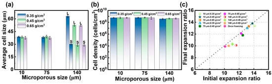 Cell morphology of PBAT foamed sheets with different microporous structures. (a) Cell size; (b) cell density; (c) expansion ratio.