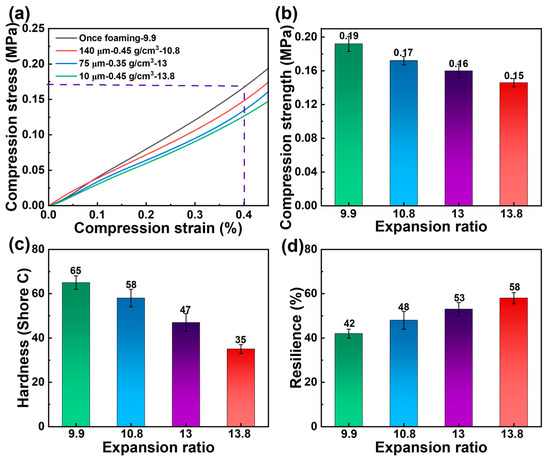 Among three pre-treated PBAT foam sheets with varying microporous sizes, the sample with the highest expansion ratio was selected for mechanical characterization (Figure 10). The compression stress of PBAT foams decreases as the expansion ratio increases at the same strain. For untreated, once-foamed samples with an expansion ratio of 9.9 times, the compression strength at 40% strain was 0.19 MPa. In contrast, the expansion ratios of the pre-treated foamed samples were higher than those of the untreated PBAT foam sheets, resulting in a slight decrease in compression strength. As the expansion ratio increased from 10.8 to 13.8, the compression strength of the foamed sheets decreased from 0.17 MPa to 0.15 MPa. However, PBAT foamed samples with varying densities exhibited significant differences in hardness and rebound. As shown in Figure 10c,d, the PBAT foam sheets treated with the pretreatment strategy demonstrated lower hardness and higher resilience when foamed under the same conditions. These findings suggest that the pretreatment strategy enhances foam softness and flexibility, in addition to facilitating rapid saturated foaming.