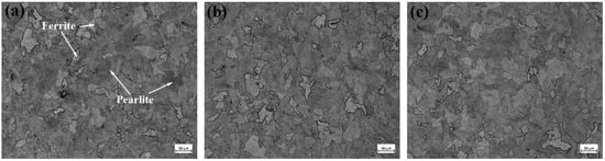 Figure 1 presents the microstructures of the experimental steels containing three distinct Ce concentrations. As observed in the figure, the microstructures of the three steel groups consist of ferrite and pearlite, with the polygonal, bright white grains representing ferrite and the alternating black-and-white regions corresponding to pearlite. These two phases are distributed at regular intervals. Specifically, as shown in Figure 1a, the 1# experimental steel without Ce addition exhibits a relatively low pearlite content with an uneven distribution. The ferrite phase is more abundant, and its grain size is relatively large. In contrast, Figure 1b illustrates the 2# experimental steel, where the addition of Ce results in a reduction in both ferrite and pearlite grain sizes. The rare earth elements facilitate a slight grain refinement, and the proportion of pearlite has increased. Figure 1c further illustrates that the grain size of the 3# experimental steel is finer than that of the 2# steel. Additionally, the amount of pearlite is significantly increased, with its distribution becoming more uniform and dispersed.