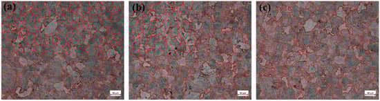 Grain size measurements of the three experimental steel groups were conducted using ImageJ software (Version 1.52), and their corresponding data are presented in Figure 2, with the summarized results provided in Table 2. Specifically, the average grain size of the 1# experimental steel is 62.4 μm, while for the 2# experimental steel, it is 57.3 μm, and for the 3# experimental steel, it is 55.7 μm. When compared with the 1# experimental steel, the 2# experimental steel exhibits an 8.17% decrease in average grain size, whereas the 3# experimental steel shows a 10.73% reduction in grain size.