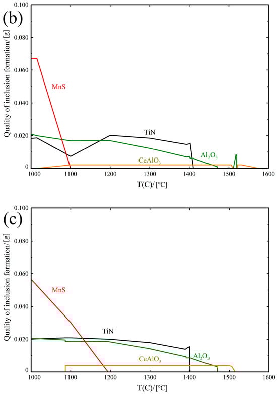 Based on the composition of the experimental steels and calculations performed using the FactSage thermodynamic software, the sequence of inclusion precipitation is illustrated in Figure 3. Figure 3a presents the thermodynamic calculation results for the 1# experimental steel, which does not contain any rare earth elements. It can be observed that the primary inclusions in the 1# experimental steel are Al2O3, TiN, and MnS, with the precipitation of TiN and MnS gradually increasing as the temperature decreases. As the temperature drops below 1400 °C, the precipitation of TiN stabilizes, while the precipitation of MnS becomes stable when the temperature falls below 1350 °C. Al2O3, on the other hand, remains continuously stable throughout the entire temperature range in the molten steel. The sequence of inclusion precipitation in the 1# experimental steel is thus Al2O3 > TiN > MnS. Figure 3b,c present the thermodynamic calculation results for the 2# and 3# experimental steels, which contain rare earth elements. From Figure 3b,c, it can be observed that the primary inclusions in the 2# and 3# experimental steels consist of Al2O3, TiN, MnS, and CeAlO3. As the temperature decreases, the precipitation of TiN and MnS gradually increases. Based on thermodynamic calculations, the sequence of inclusion precipitation in the molten steel of the 2# and 3# experimental steels follows the order: CeAlO3 > Al2O3 > TiN > MnS. The curve of TiN in Figure 3b decreases starting from 1200 °C and then exhibits a subsequent increase at 1100 °C. This behavior can be attributed to the addition of a small amount of Ce, which influences the chemical interactions between Ti and N. Ce may either form stable compounds or alter the stability of TiN at high temperatures, resulting in a shift in the phase behavior of TiN at different temperatures.