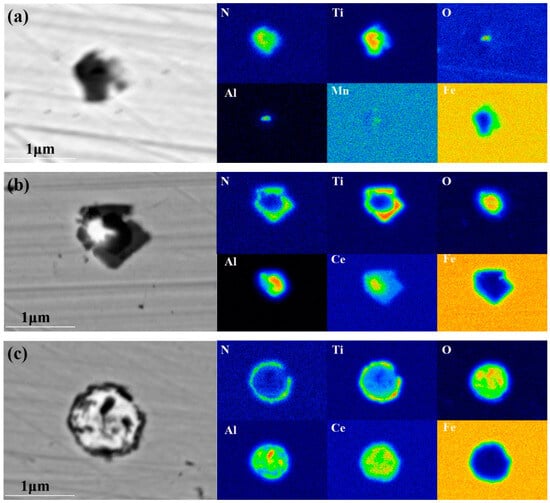 Microstructural characterization was systematically performed to investigate the morphological features and chemical constituents of non-metallic inclusions across the three distinct steel specimens, with representative micrographs presented in Figure 4. The analytical investigations were conducted employing scanning electron microscopy (SEM) coupled with energy-dispersive X-ray spectroscopy (EDS) for comprehensive phase identification and elemental quantification. The following conclusions can be drawn from the observations. As shown in Figure 4a, the typical inclusions in the 1# experimental steel, which does not contain rare earth elements, are primarily composed of nitrogen (N), oxygen (O), aluminum (Al), and titanium (Ti). These inclusions are composite Al2O3 + TiN particles with an approximate size of 1.3 μm. The dark black regions correspond to Al2O3, while the lighter black regions surrounding the core represent TiN. Figure 4b,c present the inclusions in the 2# and 3# experimental steels, which contain rare earth elements. The inclusions are rare earth composite CeAlO3 + TiN particles composed of N, O, Al, Ti, and Ce. The size of these inclusions decreases with increasing rare earth content, measuring approximately 1 μm. Furthermore, it was observed that the inclusions in the 2# experimental steel exhibit irregular shapes, whereas those in the 3# experimental steel demonstrate a more uniform, spherical morphology. Based on the analysis of thermodynamic calculations, cerium (Ce) exhibits a strong affinity for oxygen (O) and aluminum (Al), leading to the preferential formation of CeAlO3. During the initial stages of steel melting, CeAlO3 precipitates first, followed by the precipitation of TiN. Ultimately, composite inclusions are formed, with CeAlO3 acting as the nucleation core and TiN encapsulating the outer layer.