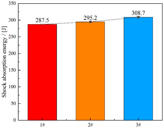 Figure 5 presents the impact test results at room temperature for experimental steels with varying cerium (Ce) content, with these data representing the average values obtained from three trials. The test specimens are impact samples with a V-shaped notch. The energy absorption characteristics during impact deformation, as illustrated in Figure 5, demonstrate significant variations among the investigated specimens. Specifically, the measured impact absorption energies were determined to be 287.5 J, 295.2 J, and 308.7 J for specimens designated as 1, 2, and 3, respectively. This systematic increase in energy absorption capacity across the specimen series suggests a progressive enhancement in impact resistance properties, potentially attributable to microstructural modifications or compositional variations implemented during material processing. The experimental results indicate that, with an increase in the cerium (Ce) content, a noticeable enhancement in the impact absorption energy is observed across all three groups of experimental steels. Specifically, the impact absorption energy of Sample 2 increased by 2.68% compared with Sample 1, while Sample 3 exhibited a 7.37% improvement over Sample 1.