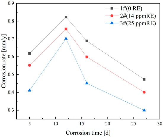 To simulate a marine corrosion environment, salt spray corrosion testing was conducted on three sets of experimental steels. The experimental protocol involved subjecting the specimens to four distinct corrosion intervals, specifically 5, 12, 16, and 27 days of exposure. The degradation kinetics were quantitatively assessed through gravimetric analysis, wherein the mass reduction in the specimens was meticulously measured to determine the corrosion progression rates. The graphical representation in Figure 7 illustrates the mean corrosion kinetics of Ce-modified steel specimens across different immersion durations. The data plots demonstrate a characteristic parabolic trend, where the degradation rates of all three experimental steel variants exhibit an initial ascending phase followed by a subsequent descending pattern with prolonged exposure time. Specifically, the curve of the average corrosion rate can be divided into three distinct stages: