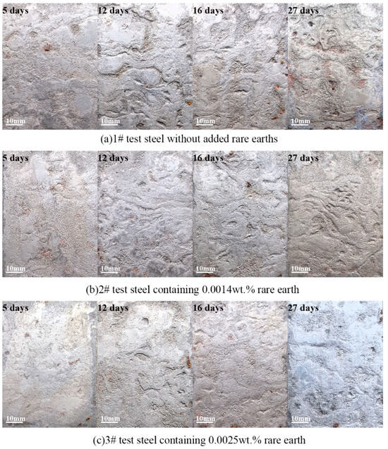 The macroscopic morphology of the test steel after 5 days, 12 days, 16 days, and 27 days of salt spray corrosion test was carried out after de-rusting, (a) 1# test steel, (b) 2# test steel, (c) 3# test steel.