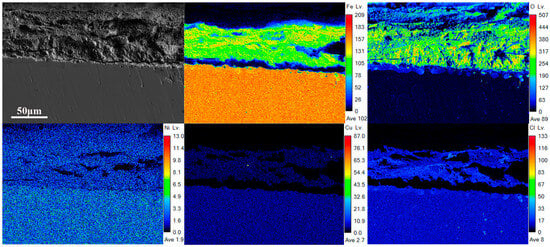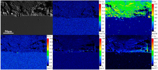 Figure 9 and Figure 10 present the EPMA spectra of Steel Sample 1 and Steel Sample 3 after a 27-day immersion period. Microstructural characterization revealed distinctive fracture patterns within the corrosion products, as illustrated in Figure 9. The presence of discontinuous fissures at the interface between the oxide layer and metallic substrate suggests insufficient adhesion strength and structural integrity of the formed corrosion products. This morphological feature further indicates the development of a porous and mechanically unstable oxide structure on the specimen surface. The spectra of Cl and O elements reveal that the rust layer was unable to effectively prevent the penetration of corrosive ions into the steel substrate. Comparative analysis of the elemental distribution profiles demonstrates a significant alteration in the chemical composition of the corrosion products. The incorporation of rare earth elements was found to promote substantial copper accumulation in the oxide matrix. In contrast, chloride ion penetration showed no detectable concentration gradient across the corrosion layer interface, suggesting effective inhibition of Cl− migration through the protective film. This suggests that the introduction of rare earth elements facilitates the accumulation of copper in the rust layer, allowing it to serve as the core for the crystallization of hydroxy iron oxide. Furthermore, the incorporation of rare earth elements promotes the refinement and densification of the rust layer’s microstructure, thereby enhancing its stability. The proposed mechanism demonstrates a significant inhibitory effect on chloride-induced degradation processes at the metal–electrolyte interface. Through the formation of a stable, protective barrier, this approach substantially decreases the electrochemical activity and mass transport kinetics, resulting in a marked reduction in corrosion propagation rates. Consequently, the modified steel exhibits superior anti-corrosion performance, as evidenced by the improved electrochemical parameters and extended service life in aggressive environments.