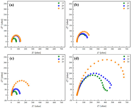 Nyquist curves of test steel soaked in 3.5% NaCl solution for different times, (a) 5 days, (b) 12 days, (c) 16 days, (d) 27 days.