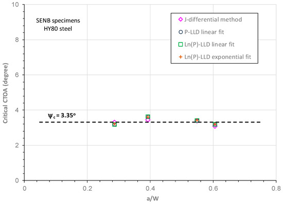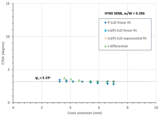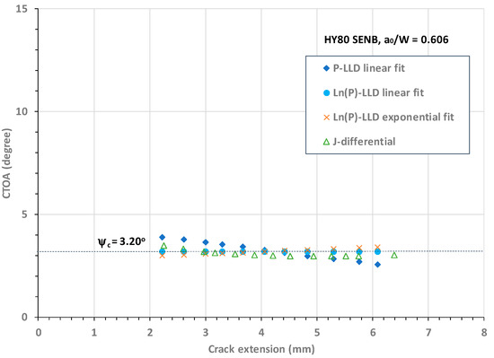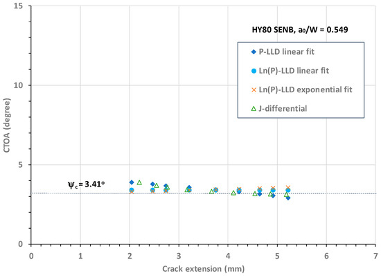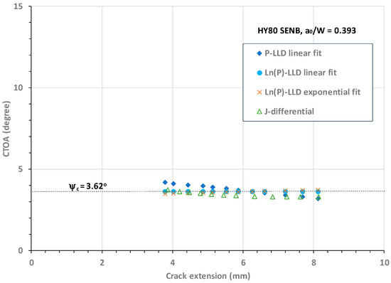 - The results showed the Ln(P)-LLD linear fit model to be comparable to the CTOA model recommended by ASTM E3039 and determined a constant critical CTOA associated with the stable crack growth in all cracks in the SENB specimens. The other three CTOA models also determined comparable constant critical CTOAs associated with stable crack growth;